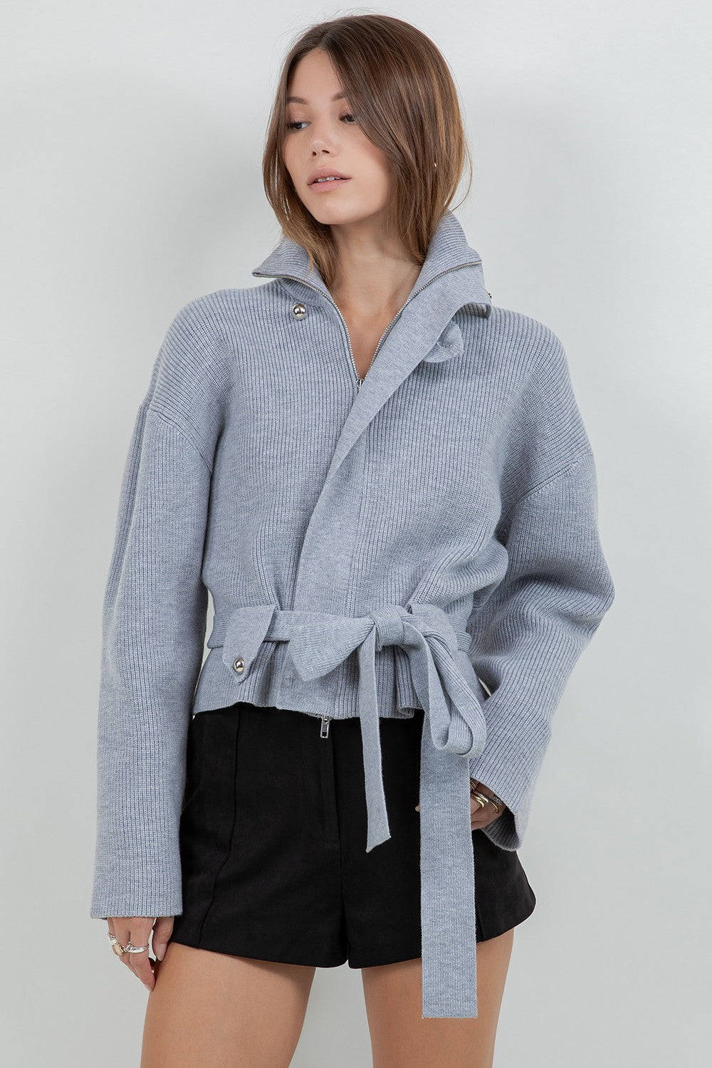 Wrap yourself in cozy sophistication with this heather grey knitted sweater jacket, complete with a chic self-accent belt that cinches your waist for an effortlessly polished look. Perfect for layering over your favorite tee or dressing up with tailored trousers, this versatile piece brings warmth and style to any outfit. The built-in belt detail adds a touch of structured elegance, making it a go-to favorite for casual days and weekend adventures alike.