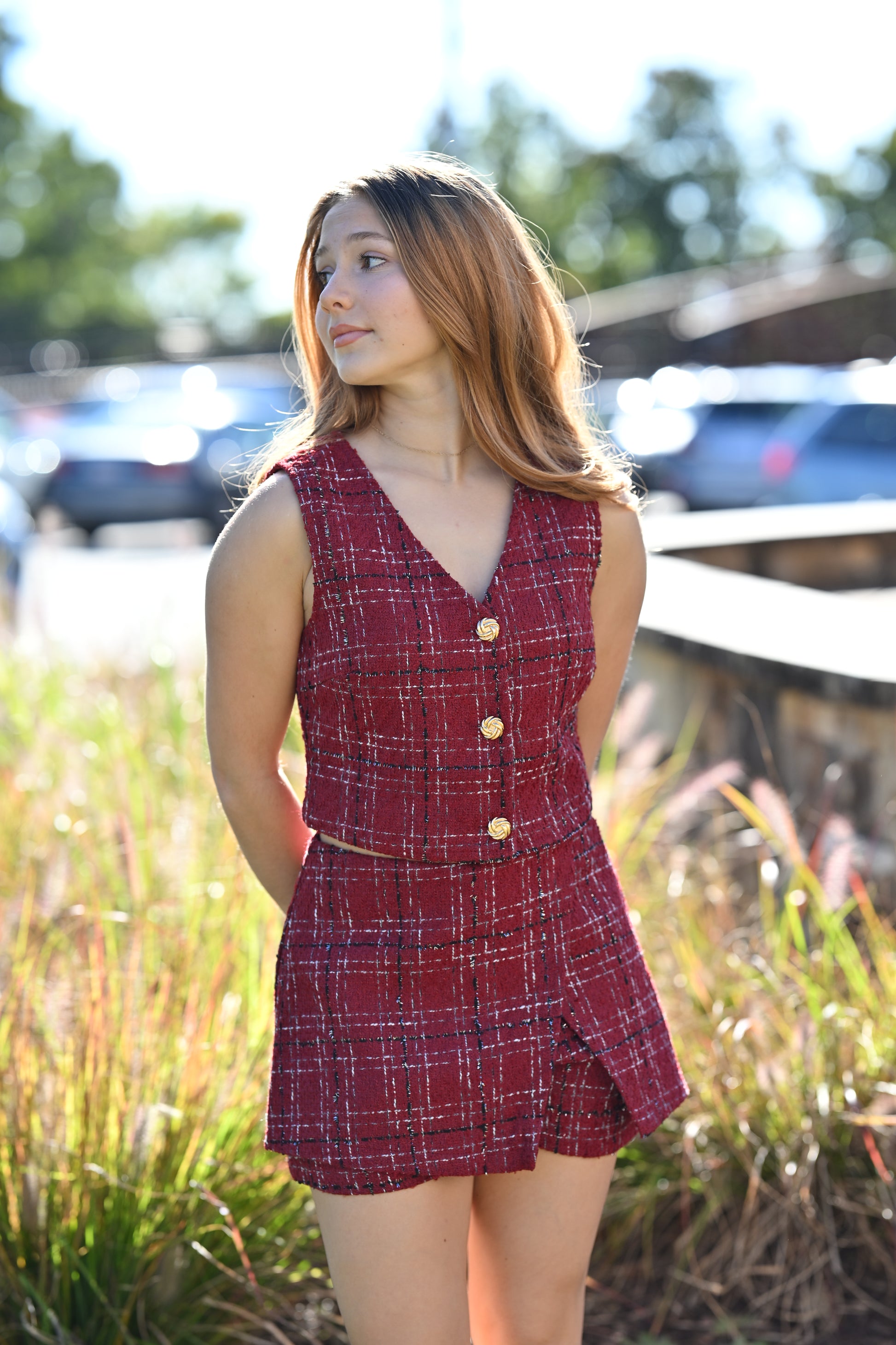 It's Giving Clueless Vibes. Burgundy Tweed Skort and zips in the back. Pair with our Dionne Vest.