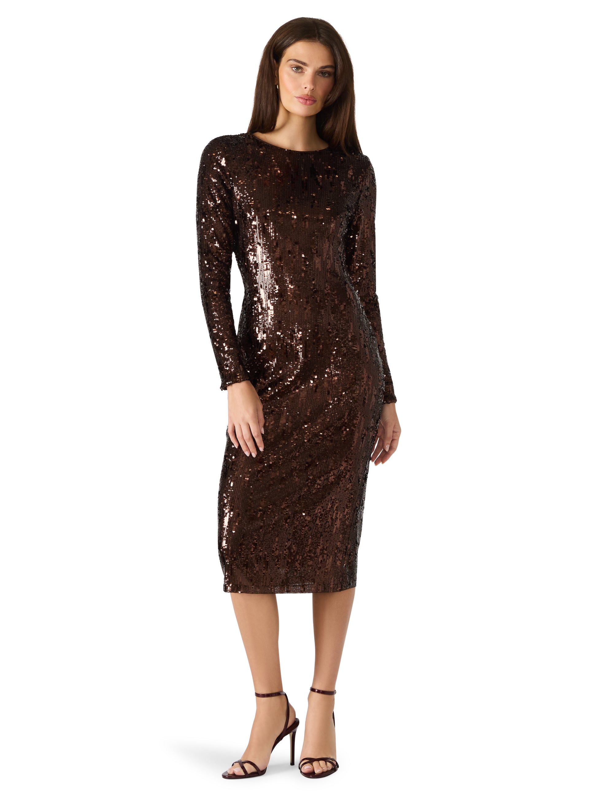 Rivulets of different-sized sequins cascade down a dress fashioned with a simple jewel neck and long sleeves that keep all the attention on the shimmer and glam.