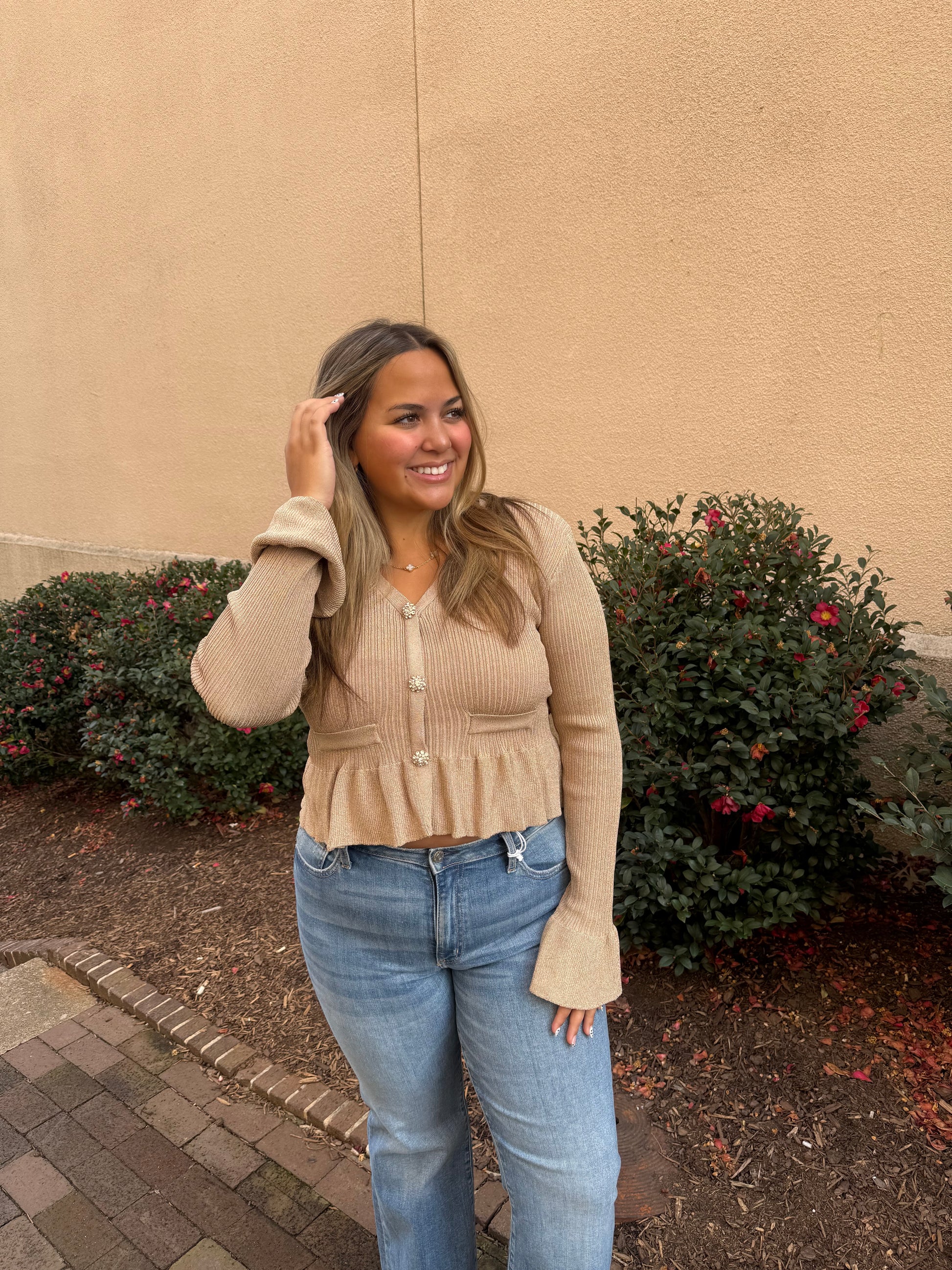 This shimmery top is peplum style and adds the perfect touch of sparkle to your holiday season with gold crystal buttons! Pair it with a skirt or jeans to add your own style.