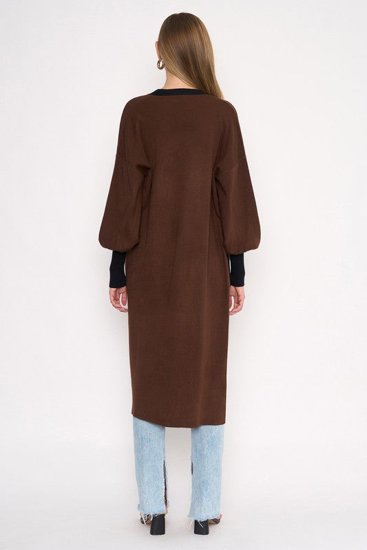 Slip into effortless style with this chic longline cardigan, complete with playful balloon sleeves that make a statement. The crisp black trim adds polish while practical side pockets keep your essentials close. Perfect for layering over anything in your wardrobe.