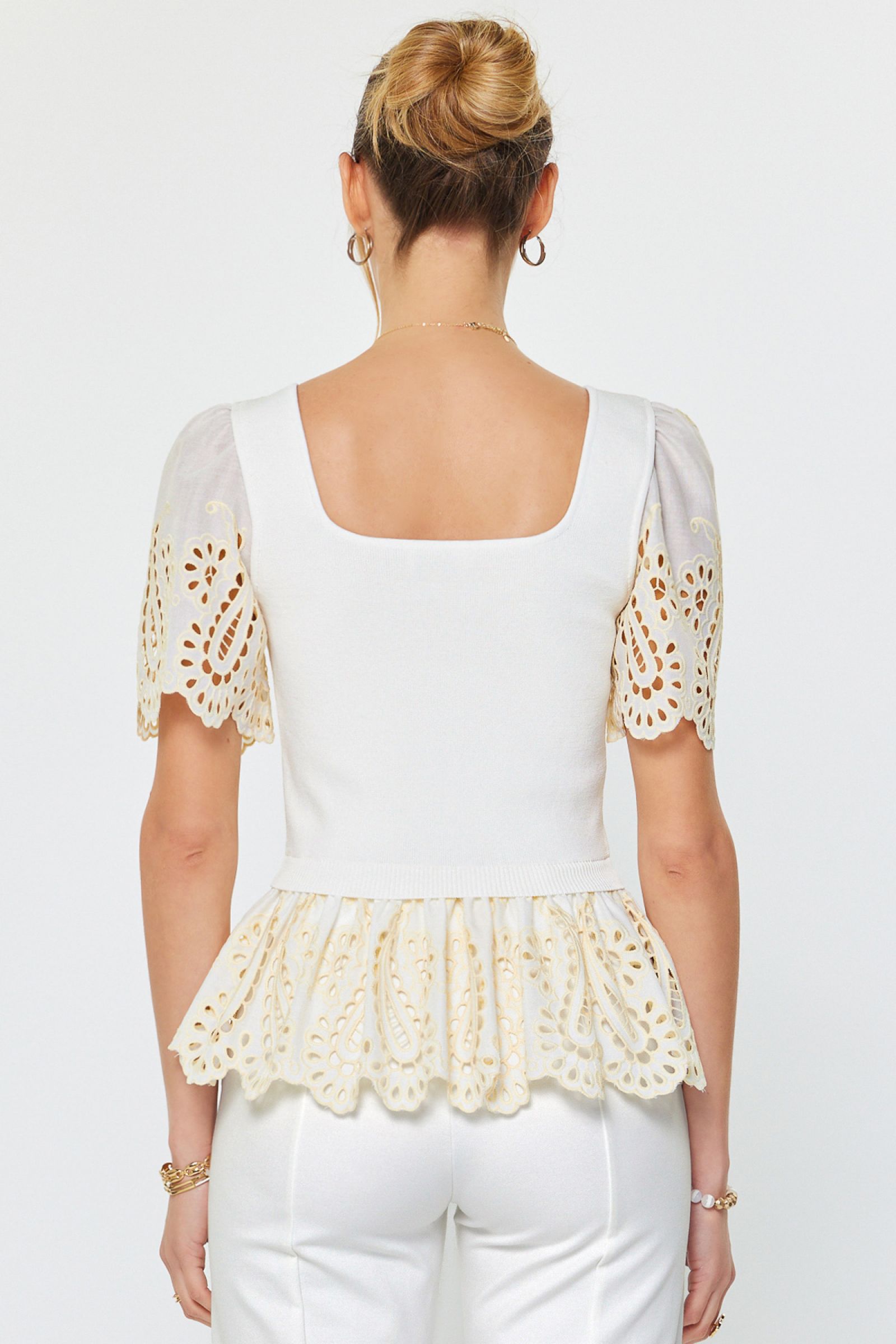 The Seabreeze Eyelet Top is a charming blend of delicate details and comfortable style. This woven and sweater hybrid features a square neckline bodice, short puff sleeves, and intricate eyelet embroidery throughout. The scalloped-edge embroidered hem and ruffle flared peplum create a feminine silhouette perfect for spring and summer occasions. Crafted from a breathable 65% rayon and 35% nylon blend, it's soft against the skin and easy to care for. Simply hand wash cold with like colors to maintain its beauty season after season.