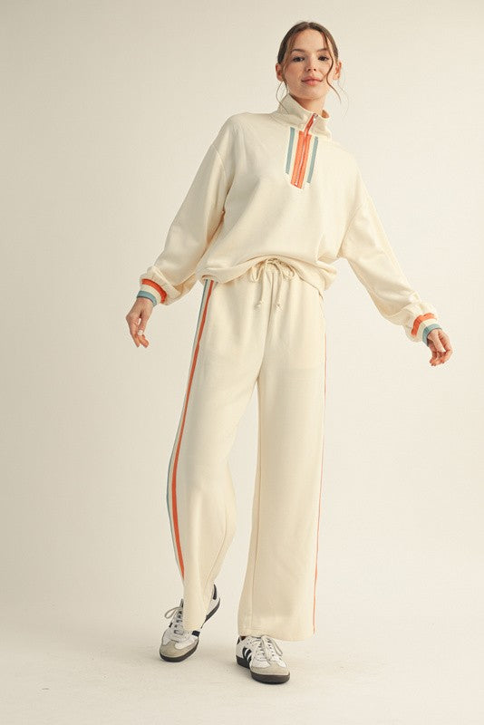 Slip into comfort with these laid-back sweatpants featuring a playful colorblock trim that adds just the right pop of style. The drawstring waist keeps everything in place while roomy side pockets are perfect for stashing your essentials. Simple, cozy, and effortlessly cool—your new go-to loungewear staple.
