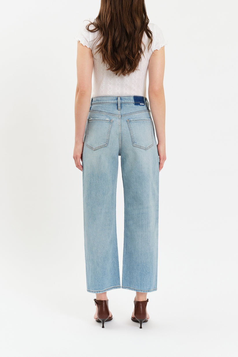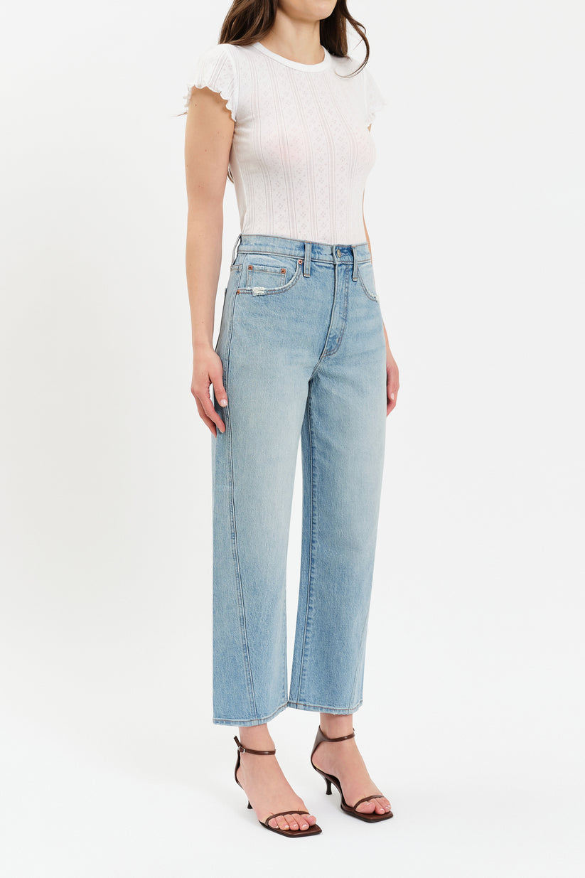 The Westward in Pulse is a high rise jean with a barrel leg silhouette, featuring a cinched waist, bowed leg, and slightly tapered ankle against a vintage-inspired light wash. Constructed from our Tough Love denim, it’s mostly rigid while yielding to your body in all the right ways.